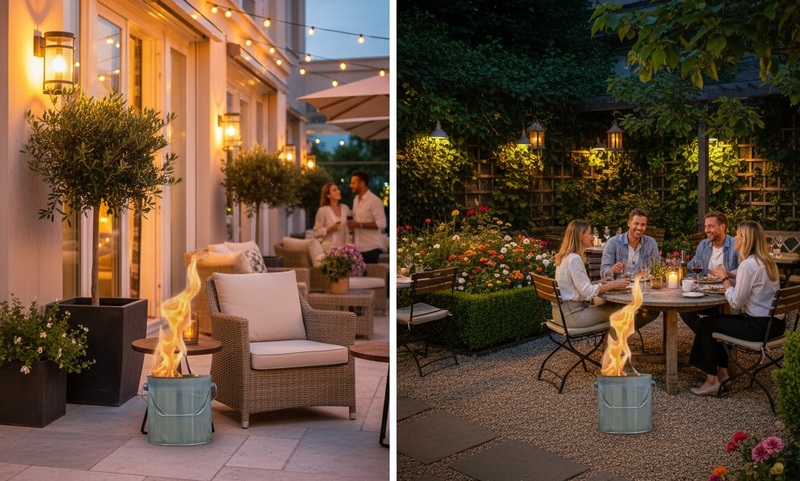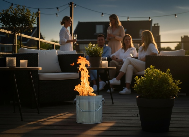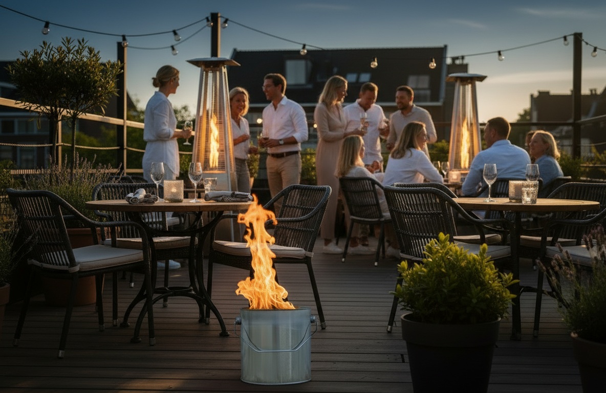 Denk aan een terras waar het langzaam begint te schemeren. De eerste vlammen worden zichtbaar en geven een warme gloed af over tafels, stoelen en gasten. Dat is het moment waarop sfeer overgaat in beleving.
